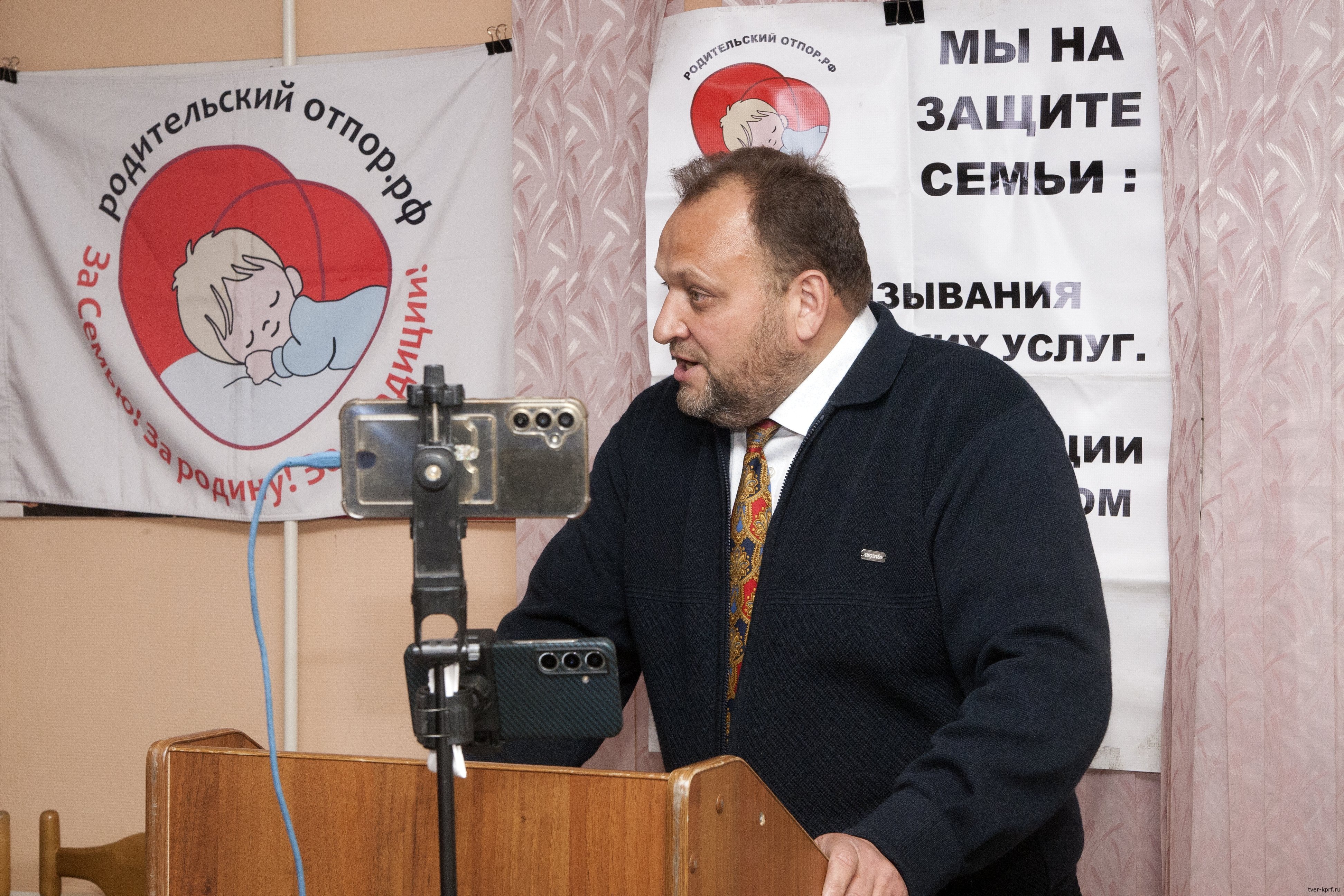 Конференцию вёл Николай Николаевич Мишустин, лидер объединения «Родительский отпор», отец шестерых детей, юрист, помощник депутата Госдумы от КПРФ, член Экспертного совета Комитета ГД по вопросам семьи, женщин и детей.