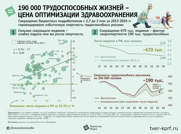 Сокращение медработников бюджетных учреждений с 2,71 до 2,04 млн человек за 2013–2024 годы оказалось фактором сверхсмертности россиян. Это показало исследование «Равенства» по данным Минздрава РФ и Росстата. Потери только трудоспособного населения за 2013–2024 годы могли превысить 190 тыс. человек.