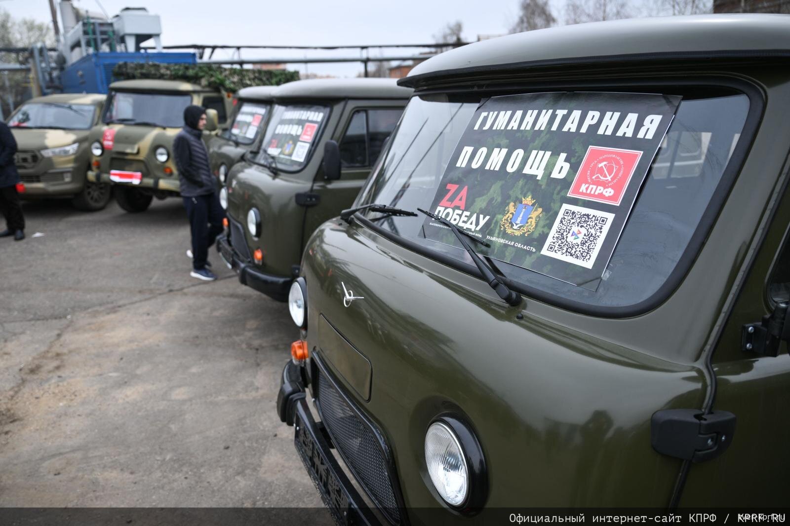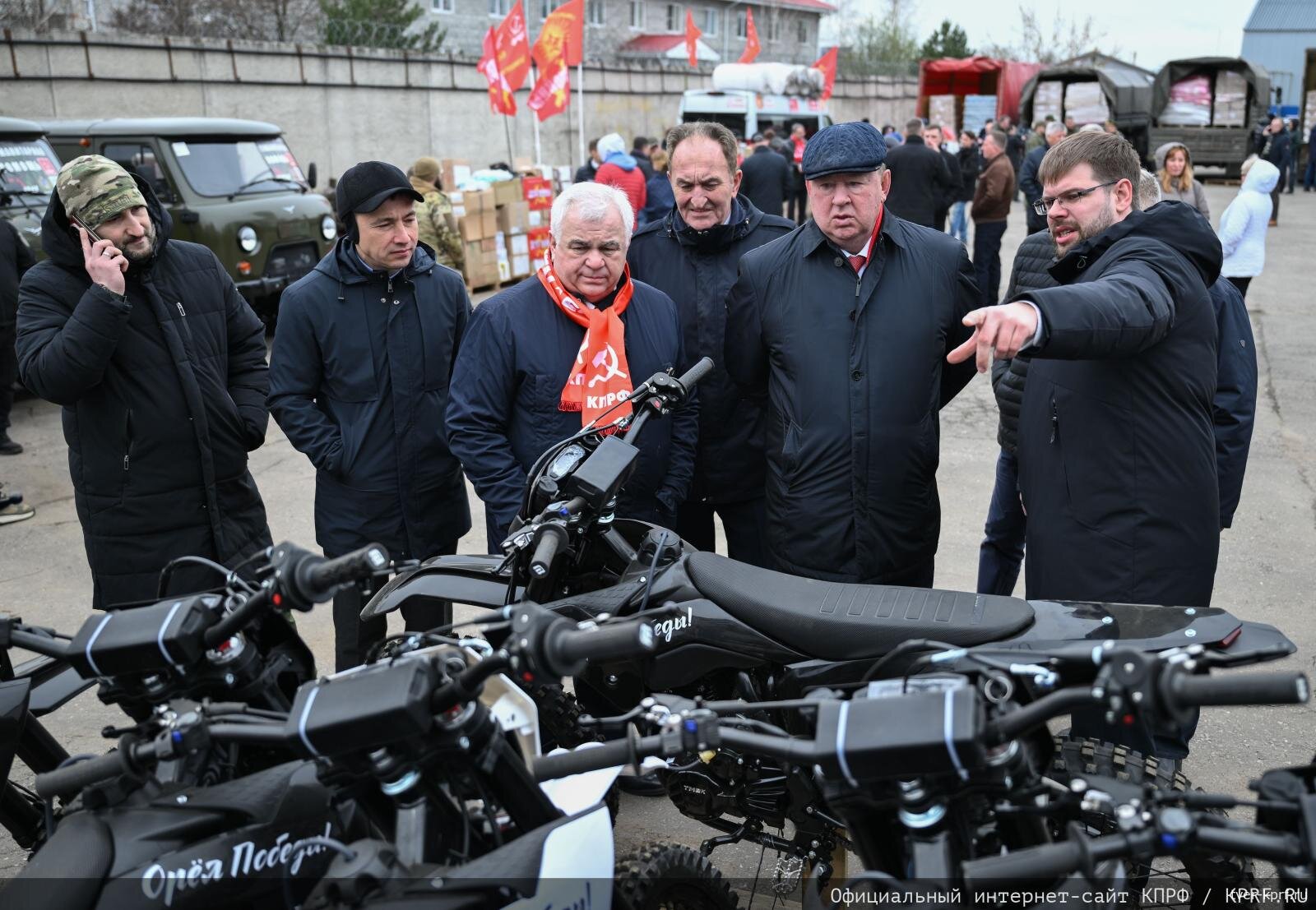 В отправке гуманитарного груза приняли участие Председатель ЦК КПРФ Г.А. Зюганов, его заместители Ю.В. Афонин и В.И. Кашин, члены ЦК КПРФ, коммунисты Москвы, Подмосковья и целого ряда региональных отделений КПРФ. Весь объем полезного груза был сформирован в соответствии с заказами и пожеланиями фронта. В этот раз в составе конвоя – спецавтомобили УАЗ, предназначенные для штурмовых бригад; квадрокоптеры; несколько десятков кроссовых мотоциклов для мобильных групп разведки; большой объем бутилированной питьевой воды, особенно востребованной с наступлением теплого периода; а также продовольствие, лекарства, медикаменты, инвентарь, маскировочные сети и другое снаряжение.