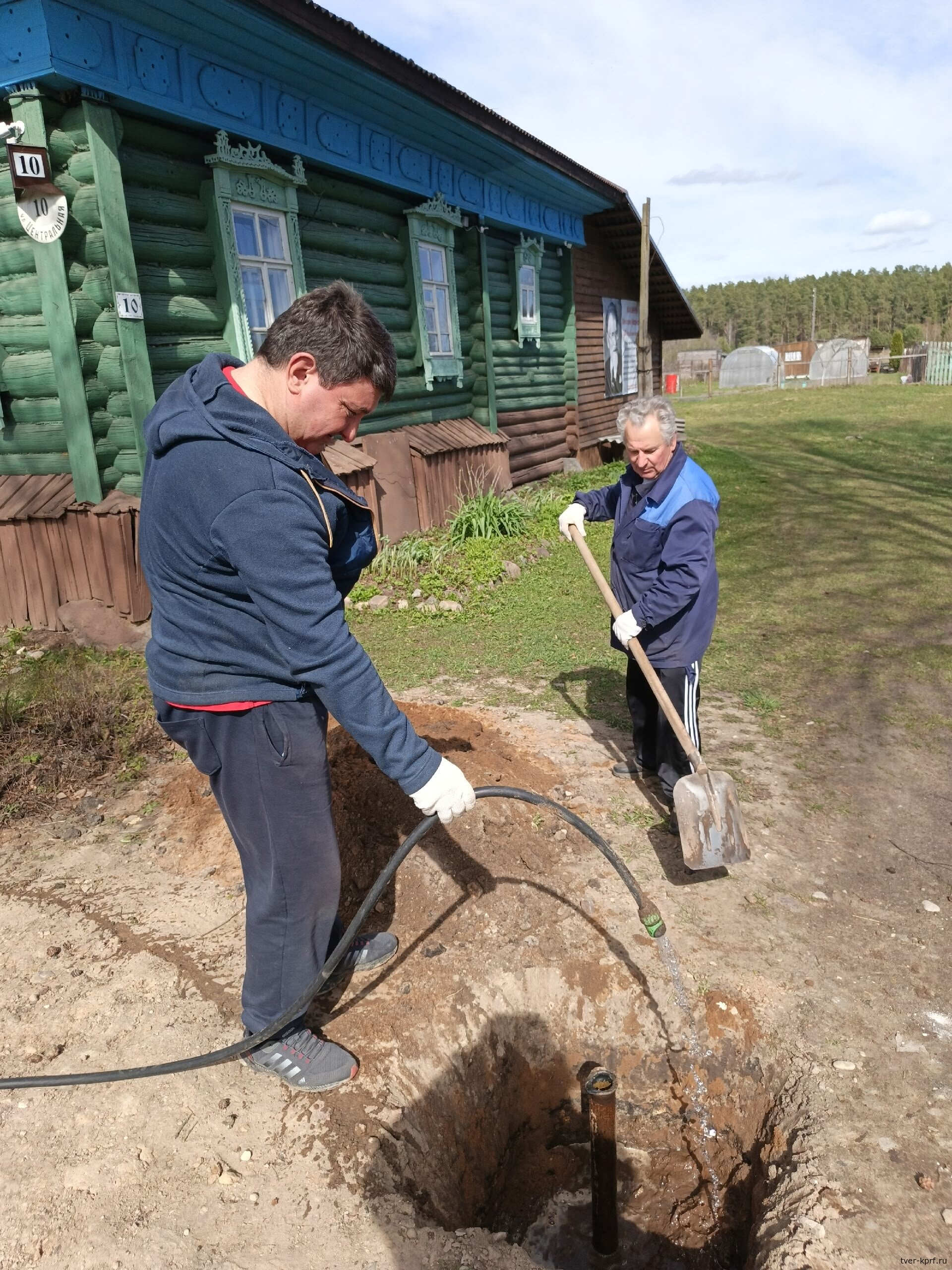 Владислав Ворвулев и Вячеслав Можаев готовят ямы для столбиков нового забора.