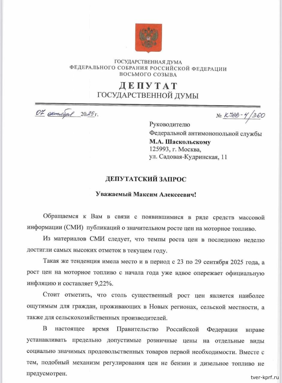 Темпы роста цен на топливо в последнюю неделю достигли самых высоких отметок в текущем году. Такая же тенденция имела место и в период с 23 по 29 сентября 2025 года, а рост цен на моторное топливо с начала года уже вдвое опережает официальную инфляцию и составляет 9,22% - рассказал сенатор-коммунист Айрат Гибатдинов.