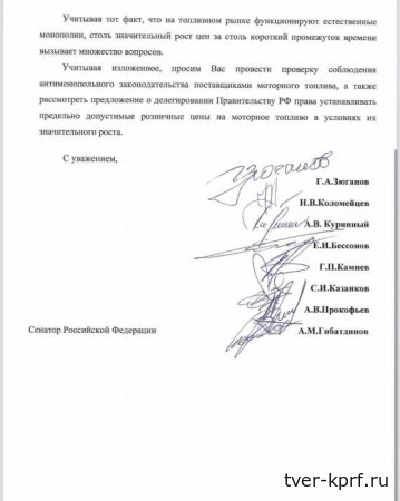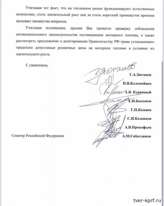 В обращении коммунисты настаивают на том, чтобы правительству России было предоставлено право устанавливать предельно допустимые розничные цены на бензин и дизельное топливо — по аналогии с социально значимыми товарами.