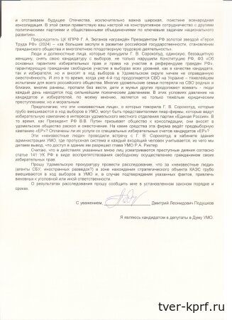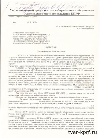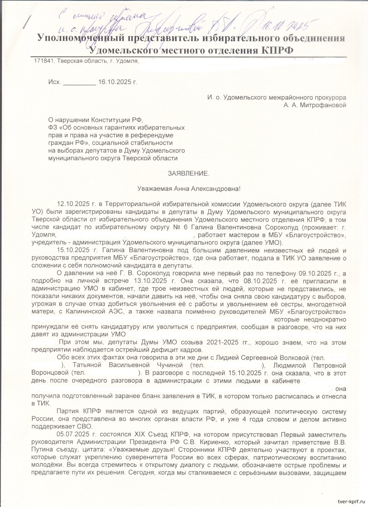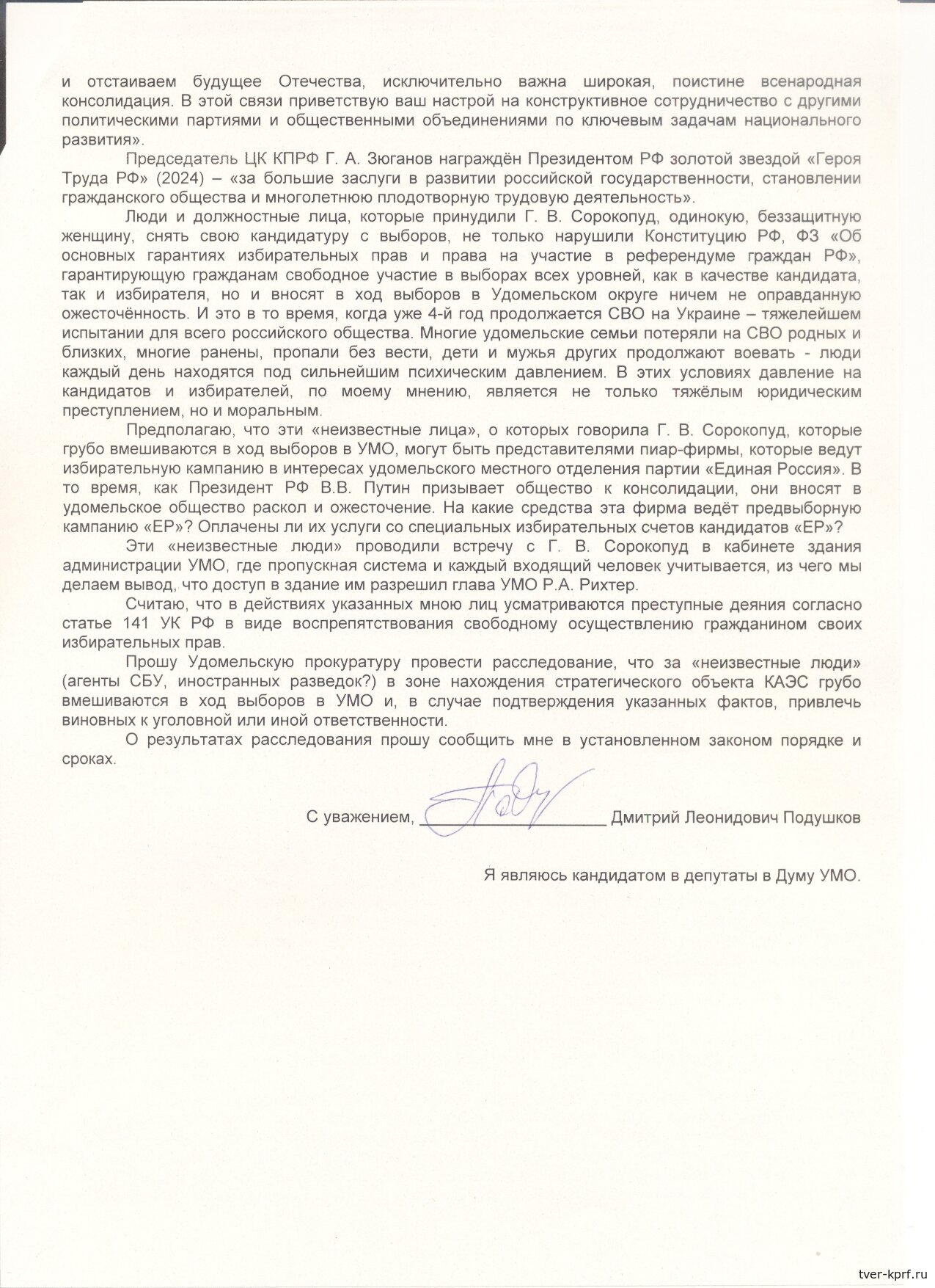 В связи с происходящим представитель КПРФ Д. Л. Подушков обратился в прокуратуру с заявлением о нарушении Конституции РФ, ФЗ «Об основных гарантиях избирательных прав и права на участие в референдуме граждан РФ», социальной стабильности на выборах депутатов в Думу Удомельского муниципального округа Тверской области (см. прикреплённый скан).