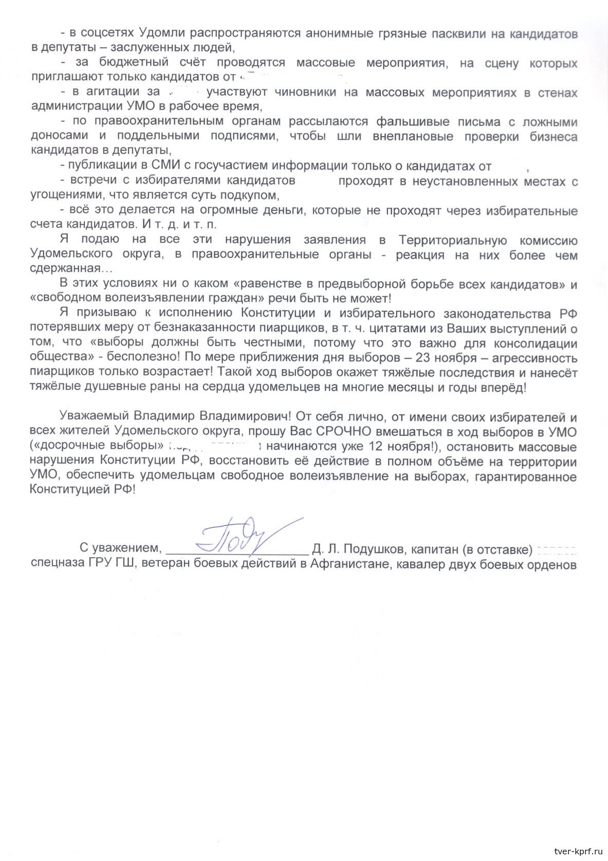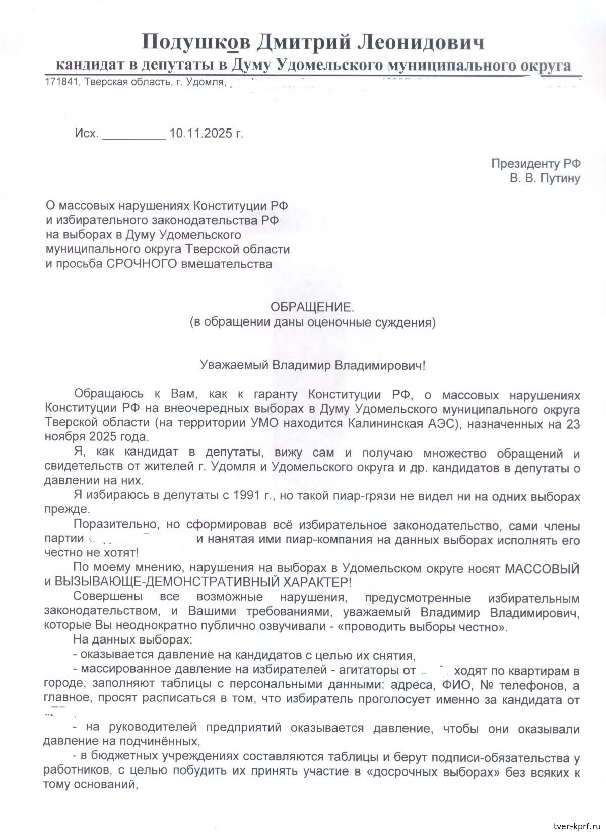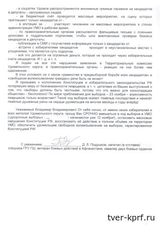 Уважаемый Владимир Владимирович! От себя лично, от имени своих избирателей и всех жителей Удомельского округа, прошу Вас СРОЧНО вмешаться в ход выборов в УМО («досрочные выборы» под давлением начинаются уже 12 ноября!), остановить массовые нарушения Конституции РФ, восстановить её действие в полном объёме на территории УМО, обеспечить удомельцам свободное волеизъявление на выборах, гарантированное Конституцией РФ!