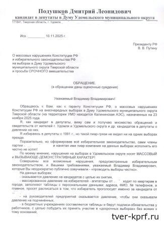 Обращаюсь к Вам, как к гаранту Конституции РФ, о массовых нарушениях Конституции РФ на внеочередных выборах в Думу Удомельского муниципального округа Тверской области (на территории УМО находится Калининская АЭС), назначенных на 23 ноября 2025 года.