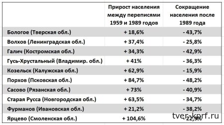 За последние советские десятилетия прирост населения в этих городах составил в среднем 54,1%. Это не такой быстрый рост, как в крупных городах (население советской Москвы с 1959 по 1989 год выросло на 74,5%), но всё-таки эти данные предельно ясно показывают: в советское время малые города успешно развивались. А вот в годы капитализма почти все малые города России начали стремительно вымирать. Средняя потеря населения по этим 10 городам – 34,9%, то есть больше трети!