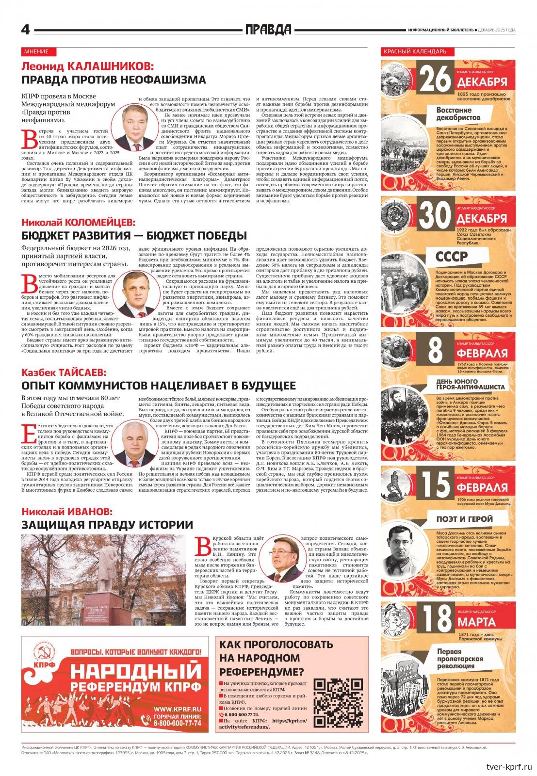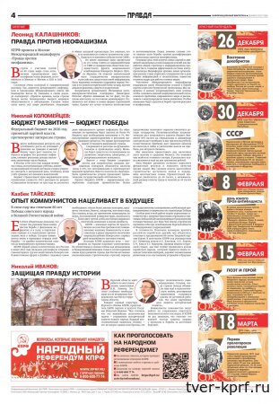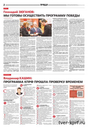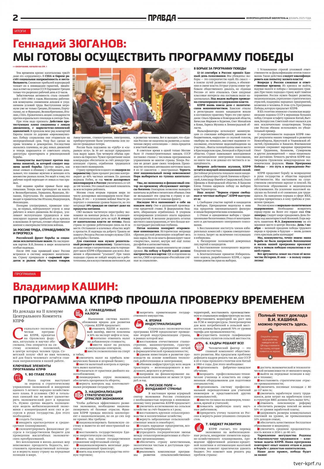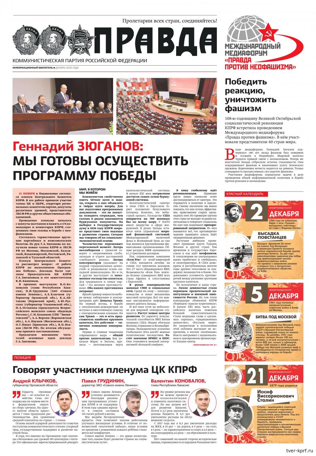 В декабрьском выпуске информационного бюллетеня ЦК КПРФ «Правда» опубликованы ключевые материалы II (ноябрьского) Пленума Центрального Комитета КПРФ. В номере представлены доклады Председателя ЦК КПРФ Г.А. Зюганова и его заместителя В.И. Кашина по вопросу «О работе КПРФ по выполнению Программы Победы», а также выступления и мнения участников Пленума.