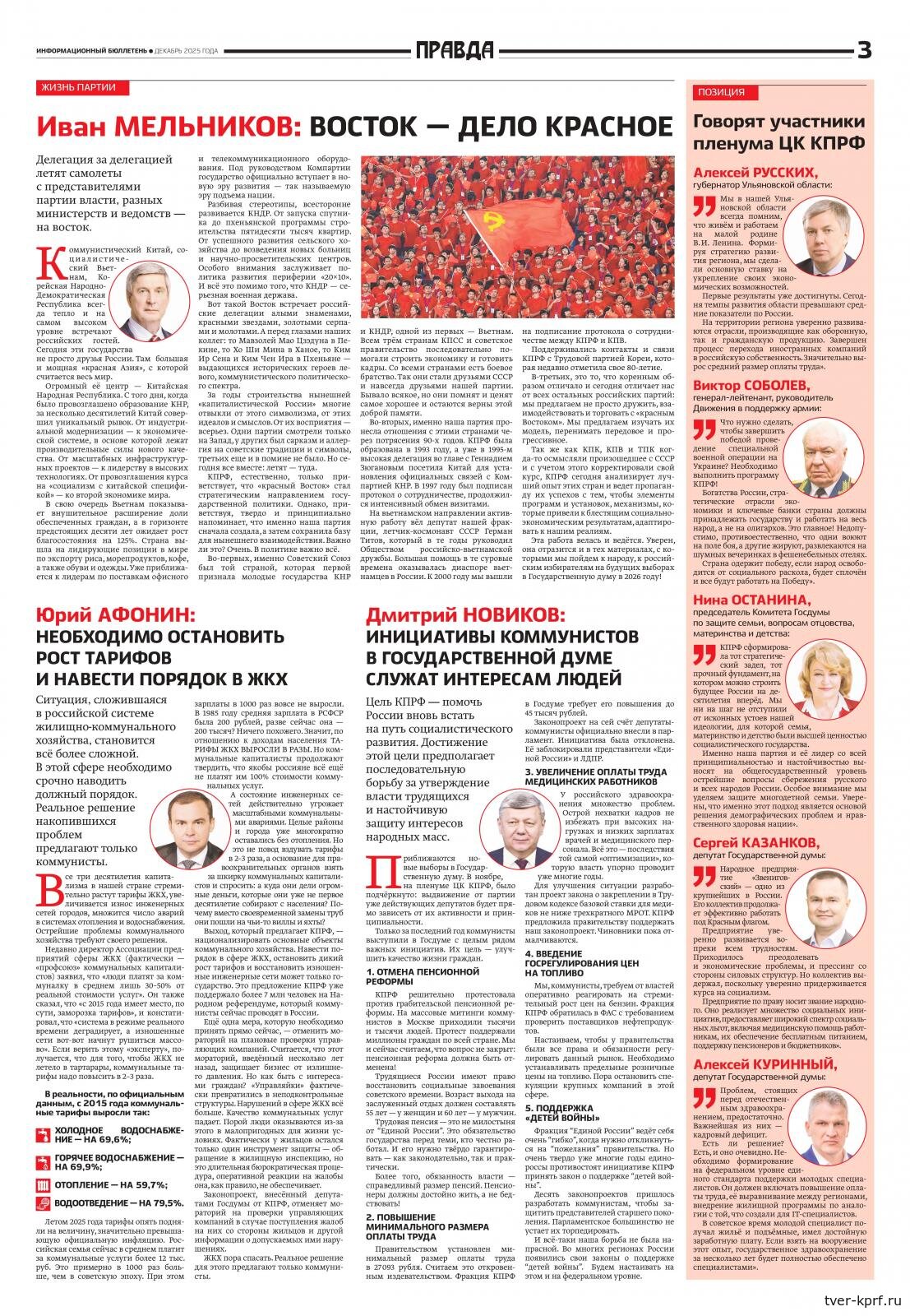 В выпуске также представлена позиция депутатов фракции КПРФ по ключевым вопросам социально-экономической политики — федеральному бюджету и тарифной политике в сфере ЖКХ.