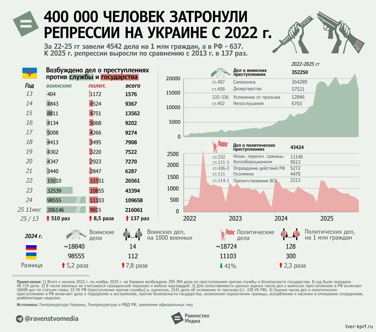 Киев развязал воинские и политические преследования уже против 395 400 граждан Украины. Столько уголовных дел возбудили с января 2022 г. по ноябрь 2025 г., подсчитало «Равенство» по данным Генпрокуратуры.