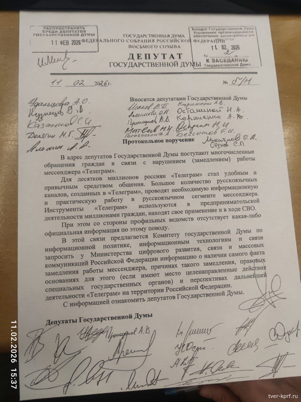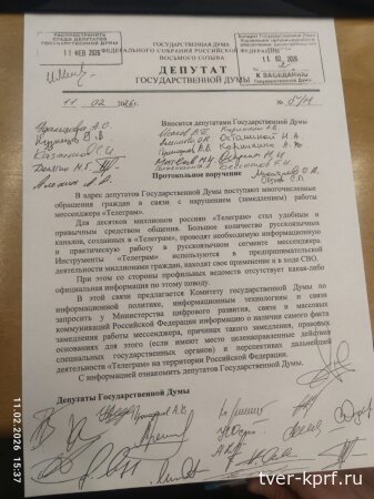Фракция КПРФ в Государственной Думе внесла протокольное поручение в связи с нарушением (замедлением) работы мессенджера «Телеграм».