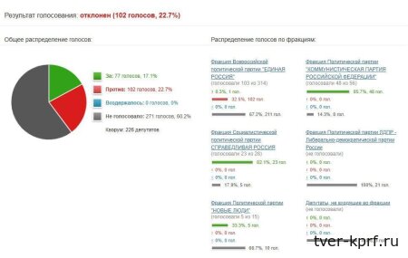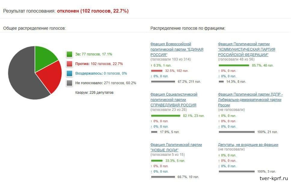 Однако профильный комитет инициативу коммунистов не поддержал. При голосовании большинством (102 против 77) предложение КПРФ было отклонено. При этом другие депутаты от голосования уклонились.