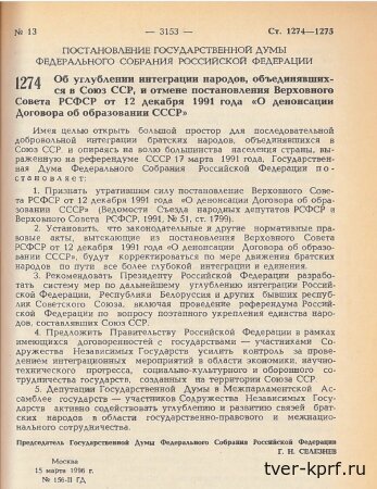 Этим решением Дума объявила юридически ничтожными документы о развале СССР, совершённом кучкой политиков-предателей в лесной глуши Беловежской пущи вопреки воле народов. И цена этого документа, проведённого КПРФ через Думу, оказалась невероятно высока.