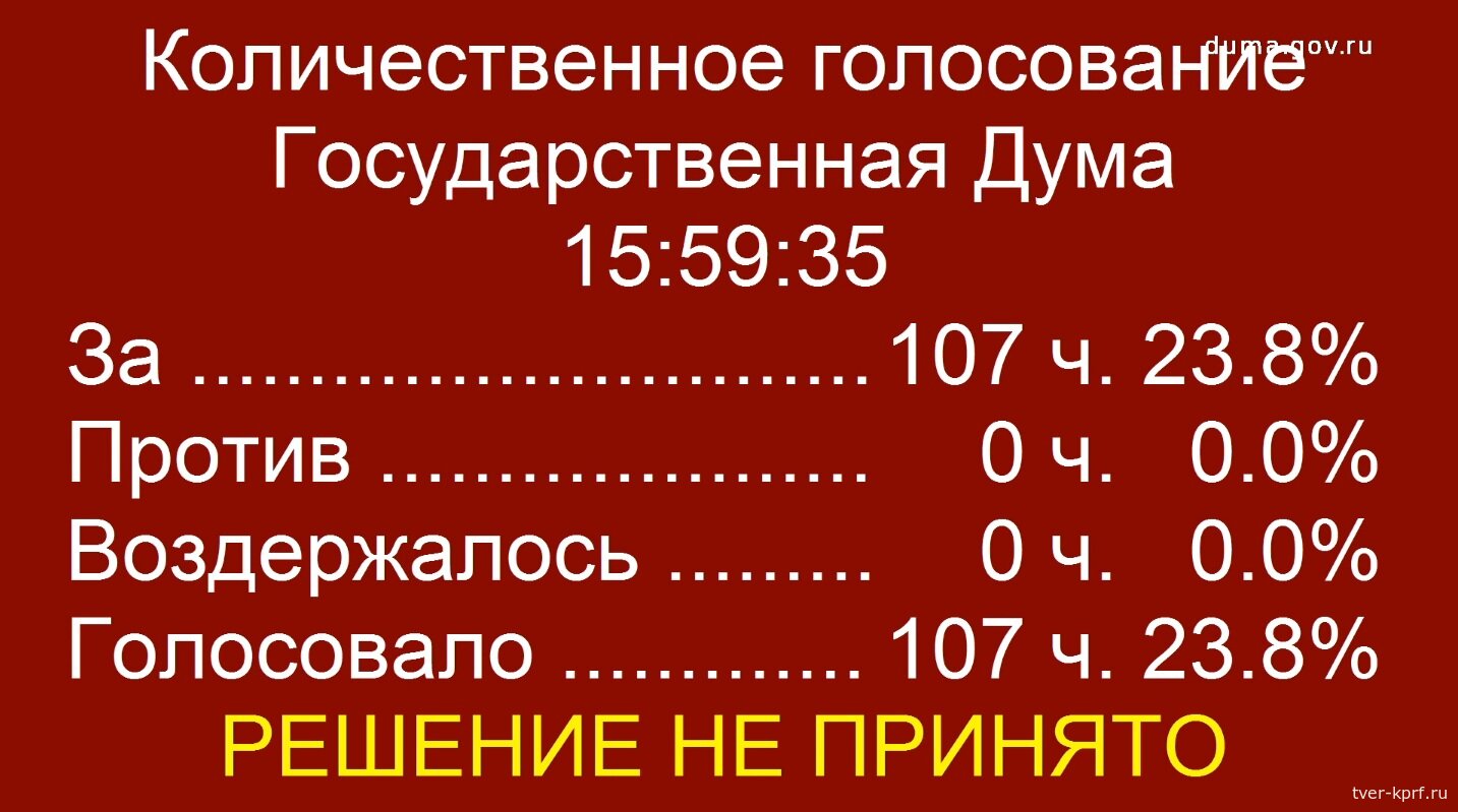 Вопрос был поставлен на голосование. Законопроект набрал 107 голосов (23,8%). Его поддержали фракции КПРФ, «Справедливой России», ЛДПР и «Новые люди», а также четыре депутата фракции «Единая Россия». Однако подавляющее большинство депутатов крупнейшей думской фракции «Единая Россия» (порядка 300) проигнорировало голосование по предложенному законопроекту, который в результате не набрал необходимого количества голосов. Так «Единая Россия» провалила законопроект, который был разработан во исполнение поручений президента страны.