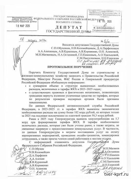 На пленарном заседании Государственной Думы развернулась острая дискуссия вокруг проблемы необоснованно завышенных тарифов жилищно-коммунального хозяйства. Поводом для обсуждения стал проект протокольного поручения, внесенный группой из 17 депутатов фракции КПРФ. Парламентарии предложили систематизировать данные о многомиллиардных переплатах населения и выработать механизмы возврата средств гражданам. Однако инициатива столкнулась с сопротивлением парламентского большинства и была заблокирована в ходе голосования.